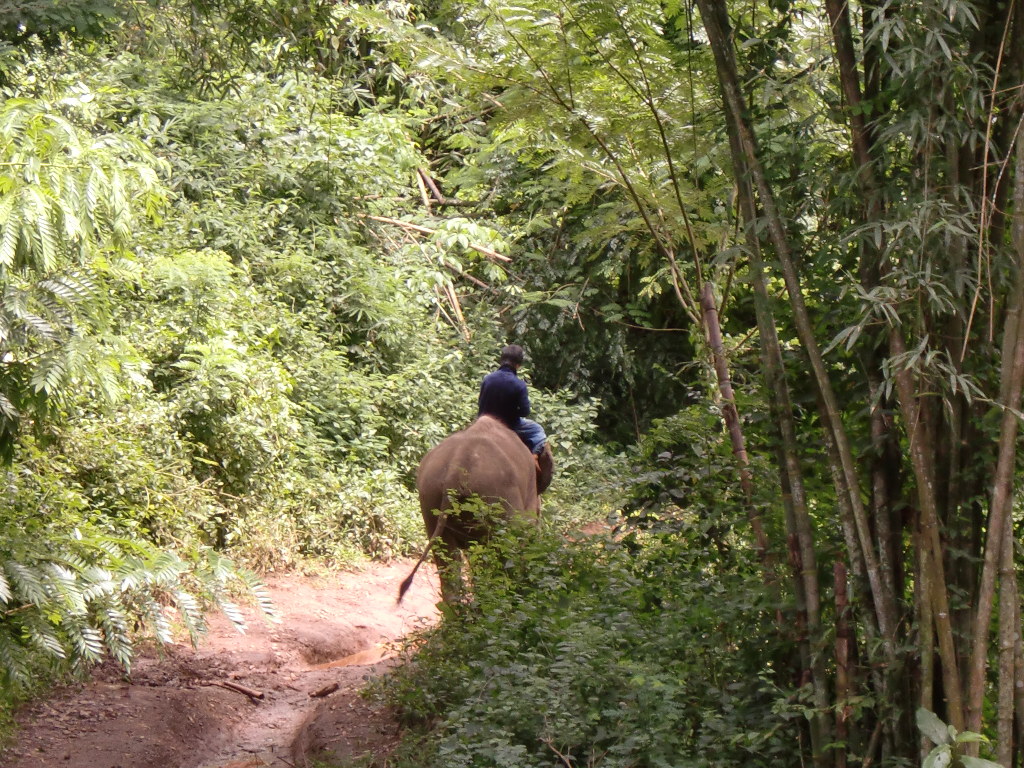 (この画像は2011年9月チャンダオ エレファントトレーニングセンターにて、キャンプでのお仕事が終わり、森に帰るゾウさんとゾウ使いさんの後ろ姿)