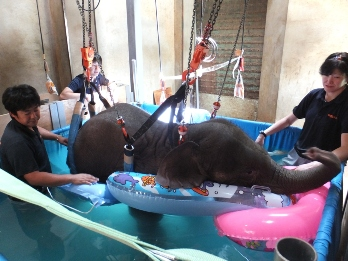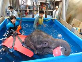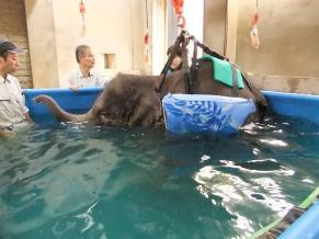 2人は国立ゾウ研究所ゾウ動物病院長のシティデット・マハサワンクル氏(45)と、チェンマイ大講師、チャレアムチャット・ソムギルド氏(36)でともに獣医師。今月14日に来日した。マーラは現在、右前脚にわずかな変形があるものの、骨はつき、固定具は既に外した。腹帯でつり上げて立たせるリハビリを継続しており、マーラ自身、食欲も立ち上がる意欲も旺盛という。
