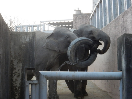 多摩動物公園ではスリランカからこの2頭(アマラとヴィドゥラ)がくるまで長い間アヌーラおじさんが1頭で暮らしていたからかも(だからタイヤがあった)、しれませんが、他園の2頭いるゾウさんにプレゼントされたり。。。