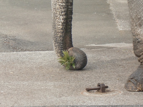 私が見たことのある、ゾウさんの好んで食べている草や葉っぱに比べると、硬く、見た目は美味しそうに見えないのですが(苦笑)、はな子さんは好きなのでしょうね。