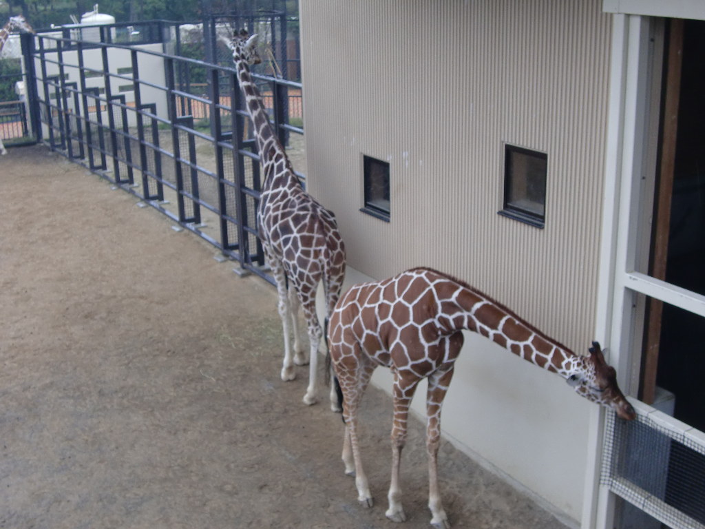 帰り際にキリンさんの前を通ったので・・・。放飼場はもっと広いのですが、この時また強い雨が降り出し、2頭で雨宿り中なのです。(クスッ)