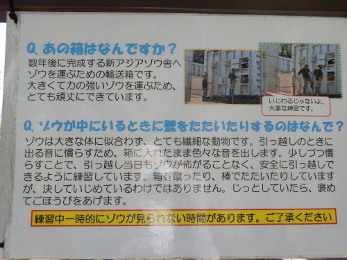 現在のゾウ舎から新ゾウ舎までは、直線距離ではそんなに距離はありませんが、安全を考慮して、コンテナ輸送をする予定のようです。そのため、コンテナに入る訓練が2016年の春ごろから始まりました。