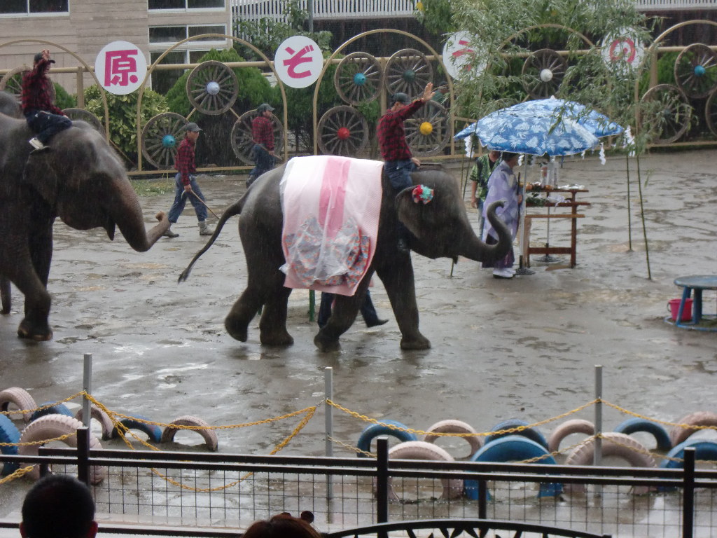 しかし、生憎のお天気・・・ゾウさんショー広場へ向かうゆめ花を見て。。。「えぇー!?(驚)」衣装はおろか、いつものリボンすら付けていません!!まさに、「ハダカのゆめ花」です。(爆笑)