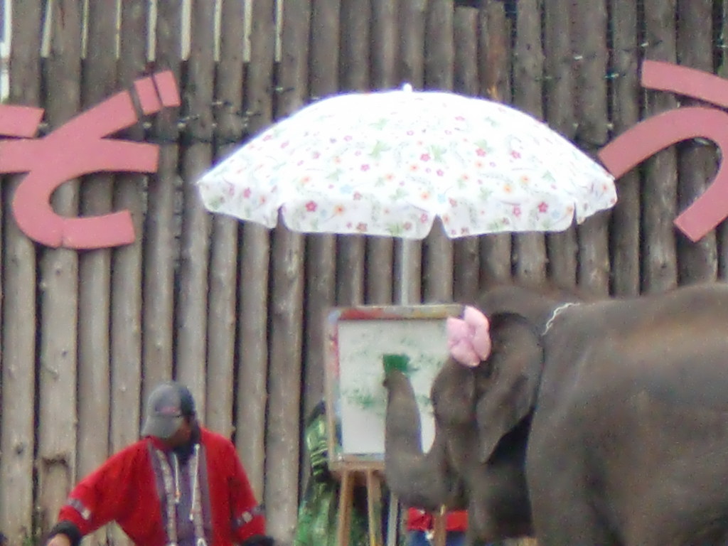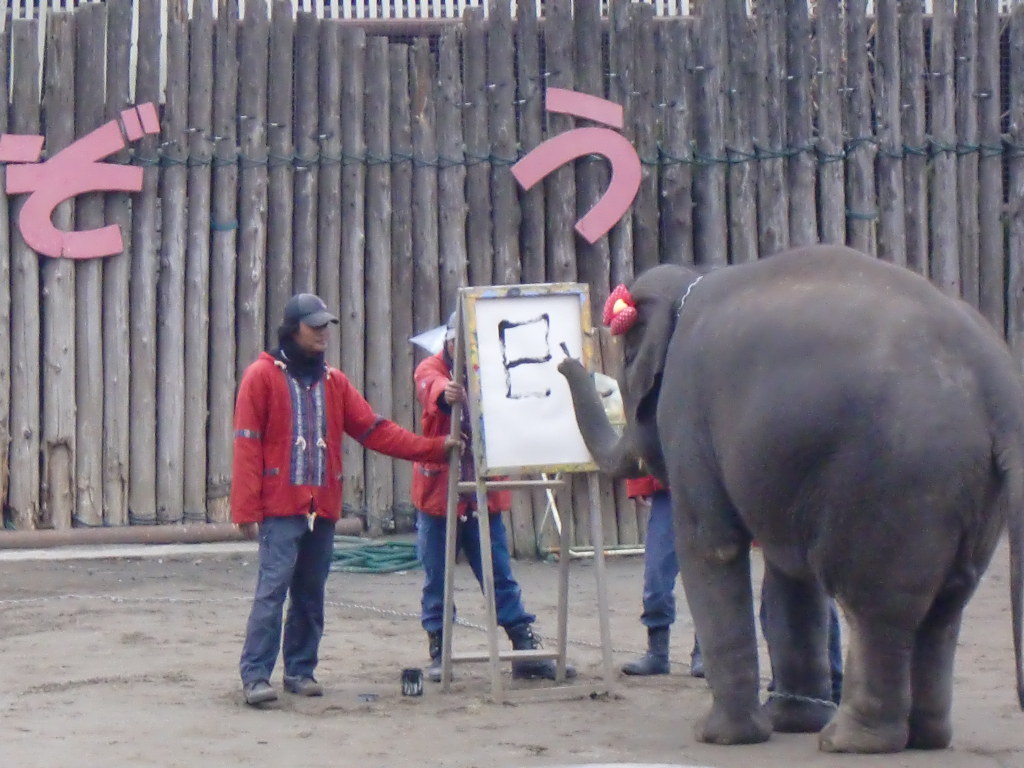 足の爪のケガ?により、ゾウさんショーはお休み中。ですが、ゾウ舎前の檻の中でひまわりの絵を描いてくれている時です。突然のゆめ花足のケガニュースは心配しました・・・。