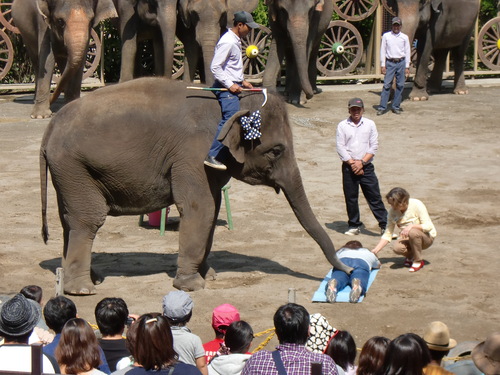 外国の動物園やキャンプでもゾウさんのマッサージが行われているところもあって、勢い余って?衣服を引っ張り、お尻が半分見えてしまったり(笑)するハプニングがあったりするようですが・・・。