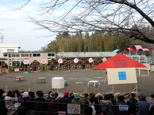 誰も何も言わないまま時間は過ぎ・・・こちらから見て右側にあった家が倒壊。(爆笑)突然過ぎて会場から「失敗か!?」的な不安な空気が漂います。(笑)