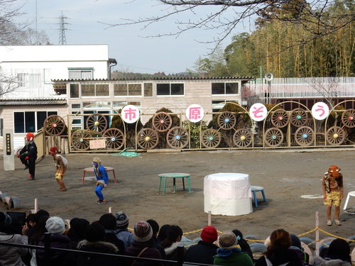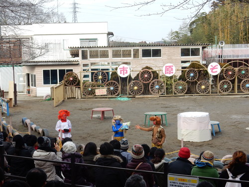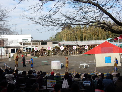 13時~の豆まきの前、午前中のショーの中で、園長が何度かこの豆まきショー(笑)の話をするのですが、そのたびに「猿芝居」と言います。(爆笑)