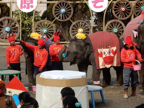そんな状況を察したのか、カニに扮した副園長が「(倒されたお母さんカニのため)復讐だー!」と叫び、家が倒された理由が理解でき(会場から安堵の空気)、ゾウさんたちによる豆まきが始まりました!
