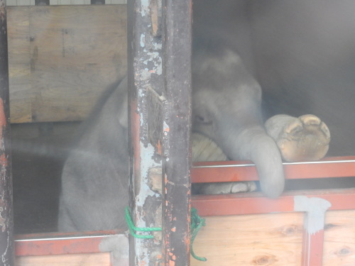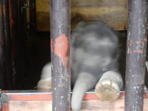 室内にいる様子はママにピッタリです。りり香や結希、もも夏は早くからゾウ使いさんに慣れて、室内(檻の中)に入ってくると後ろをついて歩くところをよく見ましたが、ら夢ちゃんはママのお腹の下、足元にいるところが多いですね。(今のところは)お姉さん、お兄さんと違い(笑)、臆病なところがあるのでしょうか。