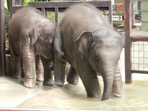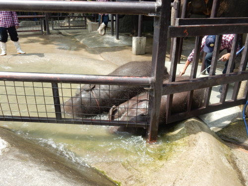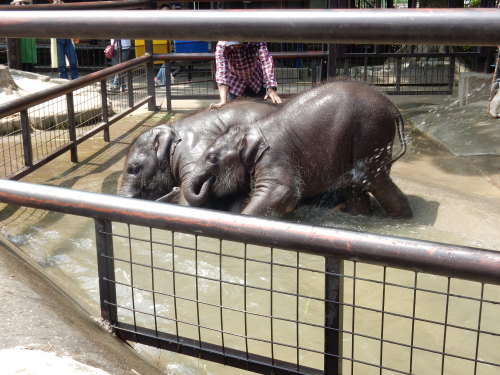 自分で自分の体に水をかけるのではなく、もも夏とら夢ちゃんは、ゾウ使いさんからお水をかけてもらうのが好きなようです。