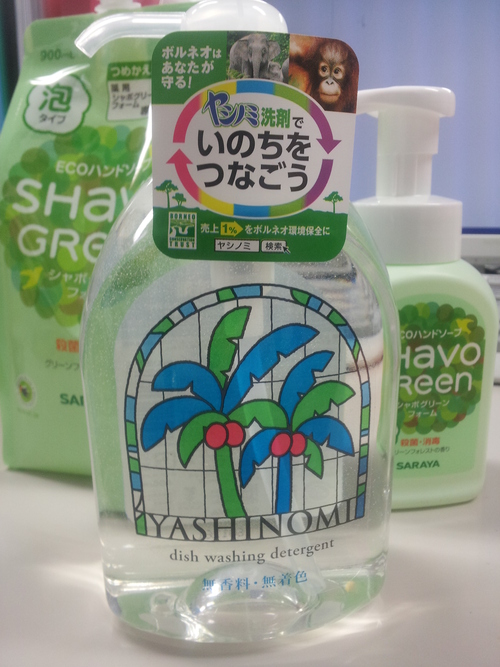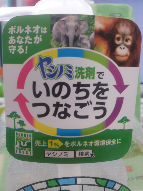 またまた同じSARAYAという会社で、Happy Elephantよりもだいぶ以前から発売されていて、認知度も高い食器用洗剤、「ヤシノミ」(上:写真真ん中)ですが、こんなシールが付いていました。